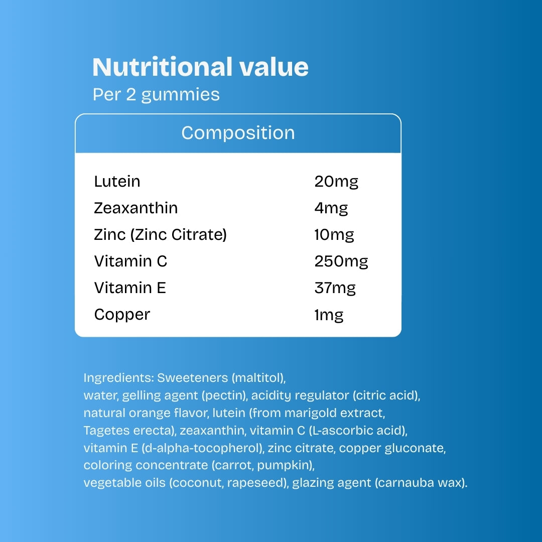 Jedes Gummibärchen enthält eine wirksame Kombination aus 10 mg Lutein und 2 mg Zeaxanthin – zwei starke Antioxidantien, die natürlicherweise in der Netzhaut vorkommen.
